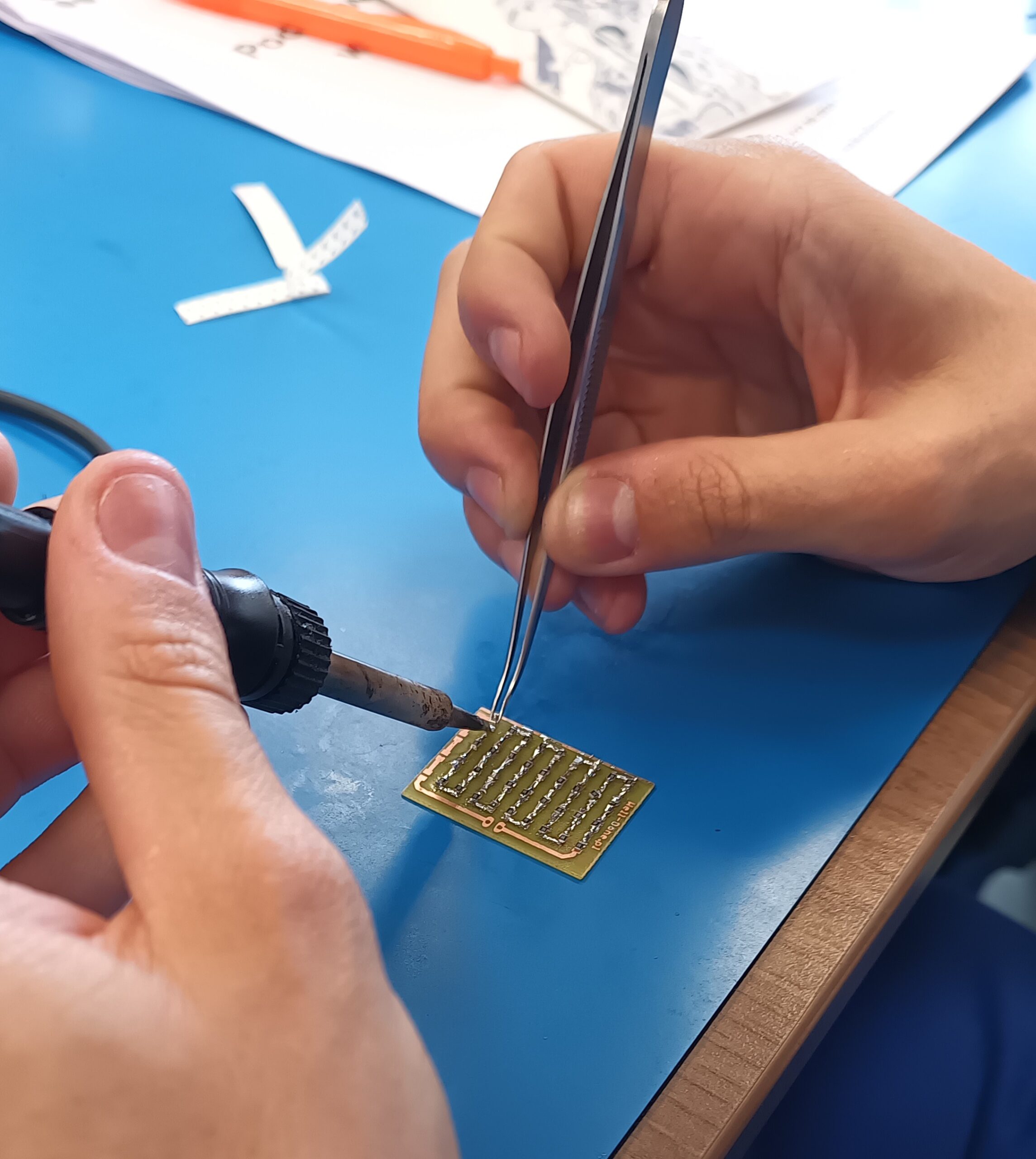 Nauka lutowania elementów przewlekanych (Through-Hole Technology) poprzez ręczne umieszczanie komponentów w otworach PCB i ich przylutowywanie.